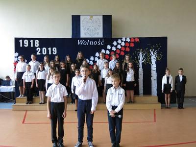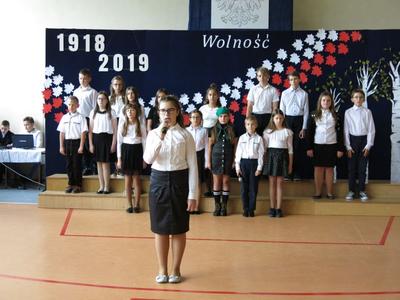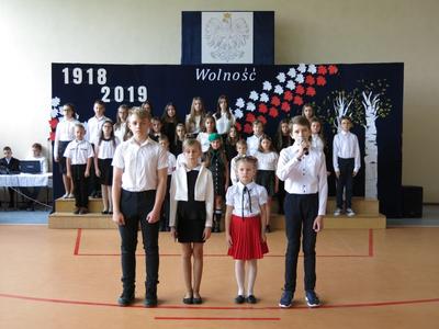 W dniu 08 listopada 2019 roku z okazji Narodowego Święta Niepodległości odbyła się w naszej szkole uroczysta akademia przygotowana przez uczniów klasy Vb,VIb oraz VII szkoły podstawowej oraz przedszkolaka z oddziału 0. W uroczystości wzięli udział: Dyrektor Poradni Pedagogiczno-Psychologicznej pani Izabela Niewiara-Sobala, Rzecznik Policji Monika Jałocha, proboszcz parafii ks. kanonik Krzysztof Pawłowski, Kierownik DK Konieczno pan Rafał Bednarczyk, bibliotekarz Biblioteki Publicznej w Koniecznie pani Katarzyna Kotulska, Przewodnicząca Rady Rodziców pani Anna Słabowska, pani Dyrektor, grono pedagogiczne, przedszkolaki i wszyscy uczniowie szkoły podstawowej. O godzinie 11.11 wszyscy uczniowie odśpiewali 4 zwrotki Hymnu Państwowego włączając się tym do akcji Ministerstwa Edukacji Narodowej „Szkoła do hymnu”. Następnie uczniowie przedstawili wzruszający montaż słowno-muzyczny - drogę, jaką przebyli nasi przodkowie walczący o niepodległą Polskę i przybliżyli nam znaczenie słowa ,,Ojczyzna", ,,Niepodległość", ,,Patriotyzm", ,,Wolność". Wzruszający scenariusz montażu słowno-muzycznego, taniec z biało-czerwonymi szarfami oraz wymowna dekoracja - to dzieło pani Marzanny Kościńskiej, Doroty Wojciechowskiej, Magdaleny Ciesielskiej, Eweliny Kluska. Piękne pieśni patriotyczne i galowe stroje uczniów tworzyły uroczysty charakter akademii. Wspaniała postawa wszystkich uczniów świadczy o tym, że ,,lekcja historii" została zaliczona na piątkę.