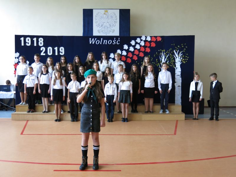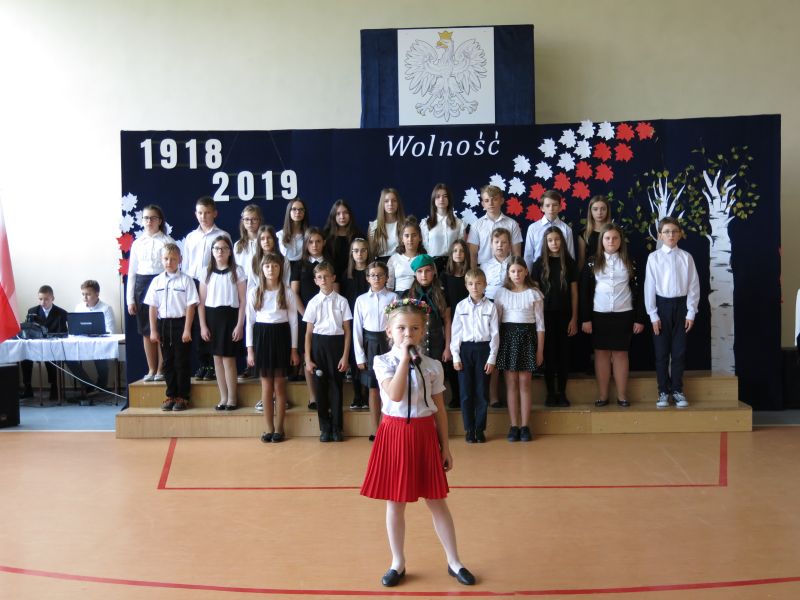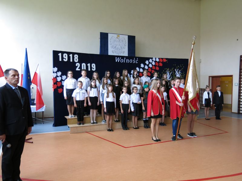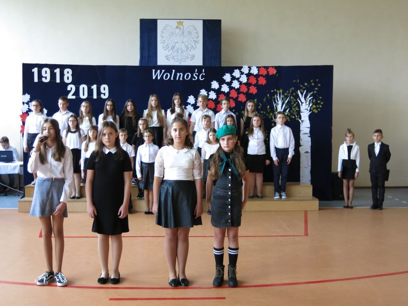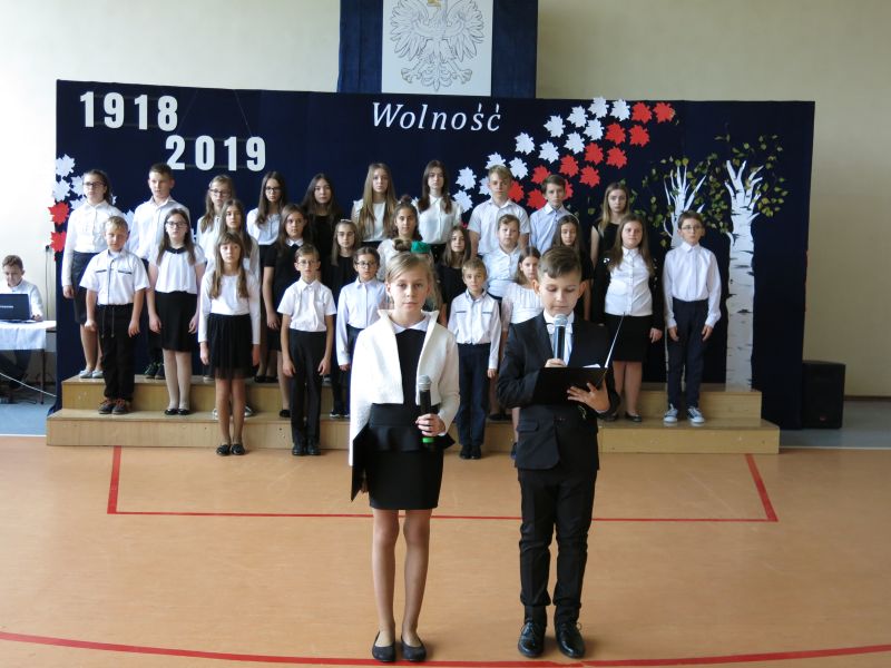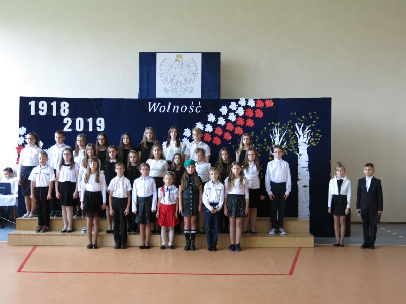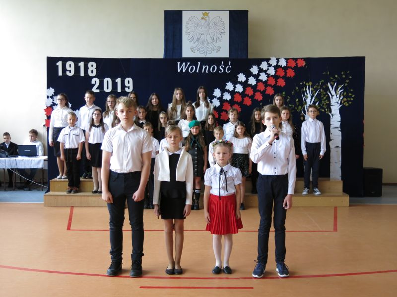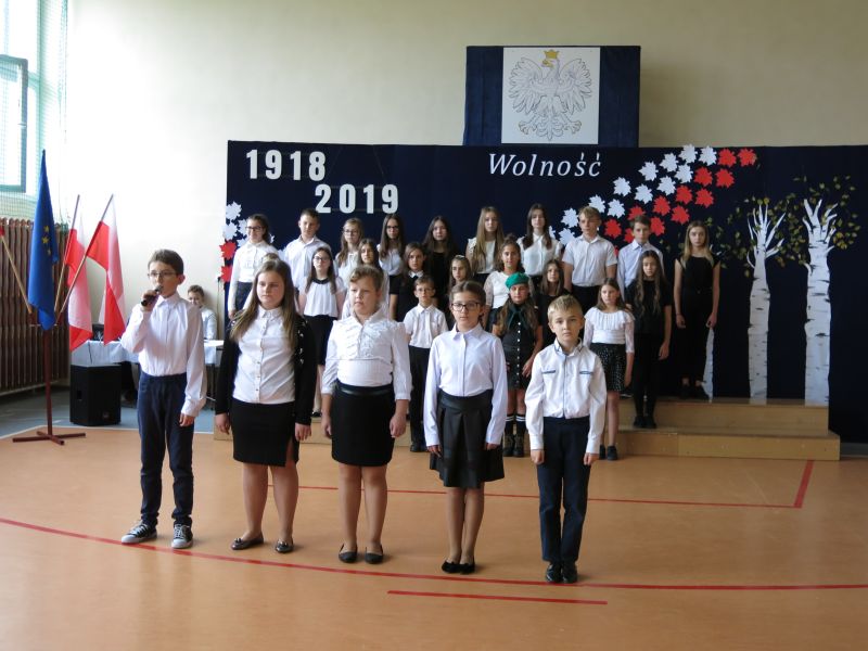 W dniu 08 listopada 2019 roku z okazji Narodowego Święta Niepodległości odbyła się w naszej szkole uroczysta akademia przygotowana przez uczniów klasy Vb,VIb oraz VII szkoły podstawowej oraz przedszkolaka z oddziału 0. W uroczystości wzięli udział: Dyrektor Poradni Pedagogiczno-Psychologicznej pani Izabela Niewiara-Sobala, Rzecznik Policji Monika Jałocha, proboszcz parafii ks. kanonik Krzysztof Pawłowski, Kierownik DK Konieczno pan Rafał Bednarczyk, bibliotekarz Biblioteki Publicznej w Koniecznie pani Katarzyna Kotulska, Przewodnicząca Rady Rodziców pani Anna Słabowska, pani Dyrektor, grono pedagogiczne, przedszkolaki i wszyscy uczniowie szkoły podstawowej. O godzinie 11.11 wszyscy uczniowie odśpiewali 4 zwrotki Hymnu Państwowego włączając się tym do akcji Ministerstwa Edukacji Narodowej „Szkoła do hymnu”. Następnie uczniowie przedstawili wzruszający montaż słowno-muzyczny - drogę, jaką przebyli nasi przodkowie walczący o niepodległą Polskę i przybliżyli nam znaczenie słowa ,,Ojczyzna", ,,Niepodległość", ,,Patriotyzm", ,,Wolność". Wzruszający scenariusz montażu słowno-muzycznego, taniec z biało-czerwonymi szarfami oraz wymowna dekoracja - to dzieło pani Marzanny Kościńskiej, Doroty Wojciechowskiej, Magdaleny Ciesielskiej, Eweliny Kluska. Piękne pieśni patriotyczne i galowe stroje uczniów tworzyły uroczysty charakter akademii. Wspaniała postawa wszystkich uczniów świadczy o tym, że ,,lekcja historii" została zaliczona na piątkę.