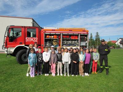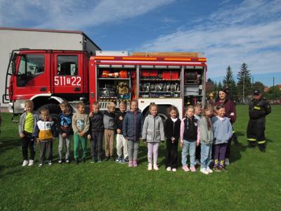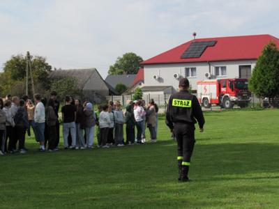 W dniu 24 września 2025 roku odbyła się w naszej szkole próbna ewakuacja przeprowadzona przez Państwową Straż Pożarną z Włoszczowy. Uczestniczyli w niej wszyscy uczniowie szkoły, przedszkolaki z oddziału 0, nauczyciele oraz wszyscy pracownicy administracyjni. Po usłyszeniu sygnału alarmowego wszystkie osoby znajdujące się w budynku szkolnym, zachowując wytyczne zawarte w instrukcji bezpieczeństwa pożarowego, bez paniki, musieli przedostać się drogami ewakuacyjnymi do punktu zbiórki, którym było boisko szkolne. Tam, w bezpiecznej odległości od miejsca zagrożenia nauczyciele sprawdzili obecność uczniów znajdujących się pod ich opieką. Po przeprowadzonej, przez Państwową Straż Pożarną we Włoszczowie kontroli budynku alarm został odwołany. Celem akcji prewencyjnej było zapoznanie naszych uczniów i pracowników szkoły z praktycznym zastosowaniem procedur dotyczących zachowania się w przypadku wybuchu pożaru lub powstania innego zagrożenia dla życia i zdrowia. Ewakuacja przebiegła bardzo sprawnie, wszyscy bezpiecznie opuścili budynek szkoły. Uczniowie klas 2-3 mieli okazję obejrzeć wóz strażacki i posłuchać do czego jest on wykorzystywany i w jakich sytuacjach.