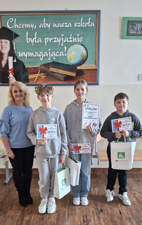 W dniu 5 listopada 2025r. odbyły się eliminacje powiatowe konkursu "Bezpieczeństwo na piątkę". Wzięło w nich udział 8 drużyn, uczniowie szkół podstawowych z: Włoszczowy (z SP nr 1 i SP nr 2), Dobromierza, Konieczna, Krasocina, Kurzelowa, Czarncy, Oleszna. Naszą drużynę reprezentowały: Kinga Michałek, Franciszek Balski oraz Mikołaj Sobczyk- uczniowie klasy V.