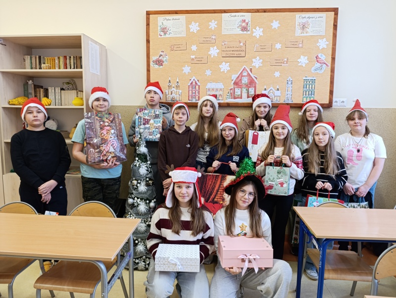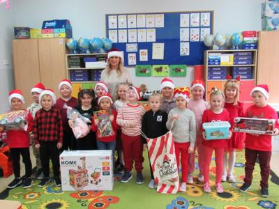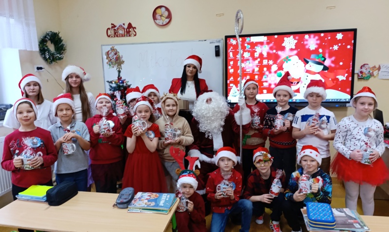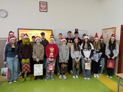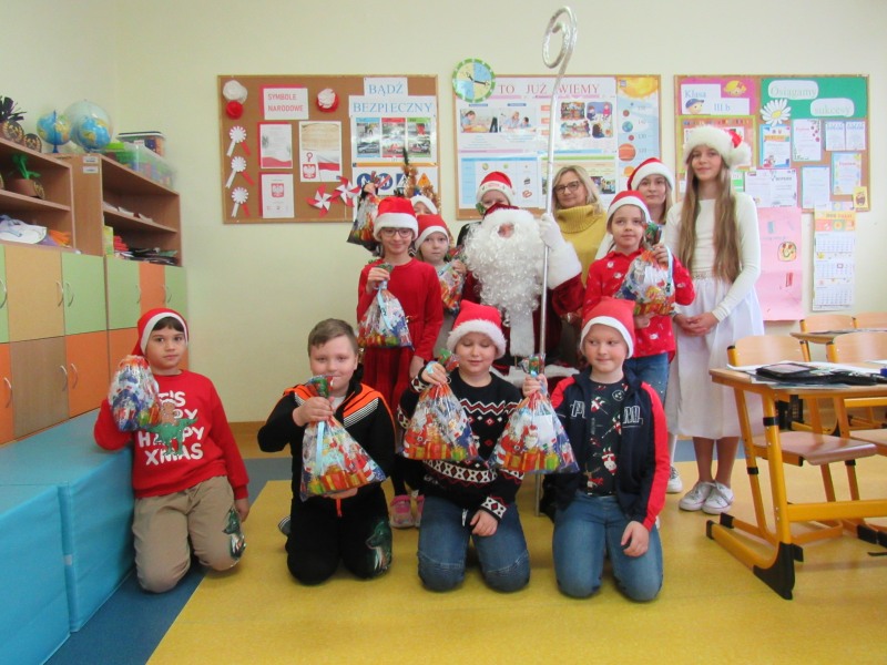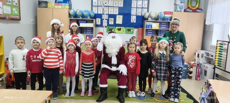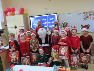 W naszej szkole pojawił się wyjątkowy gość – długo wyczekiwany Mikołaj! W towarzystwie radosnych Śnieżynek odwiedził wszystkich uczniów, klasy 0–8, niosąc ze sobą mnóstwo uśmiechu, ciepła i świątecznej magii. Od samego rana w szkolnych korytarzach panowało niezwykłe poruszenie. Dzieci nasłuchiwały charakterystycznego dźwięku dzwoneczków, a kiedy tylko Mikołaj przekroczył próg pierwszej klasy, wszyscy przywitali go gromkimi brawami. Towarzyszące mu Śnieżynki pomagały w rozdawaniu prezentów. Każde dziecko otrzymało drobny upominek – paczkę pełną słodkości lub małą zabawkę, którą z dumą zabierało ze sobą do domu. Uczniowie prezentowali także Mikołajowi krótkie wierszyki, piosenki i życzenia, które przygotowali specjalnie na tę okazję. W wielu klasach nie zabrakło wspólnych zdjęć, które z pewnością staną się piękną pamiątką na długie lata. Wizyta Mikołaja była pełna radości i serdeczności, a błyszczące oczy dzieci najlepiej świadczyły o tym, jak bardzo czekały na to spotkanie. To wydarzenie wprowadziło wszystkich w świąteczny nastrój i przypomniało, że magia Świąt rodzi się przede wszystkim dzięki dobroci i wspólnemu przeżywaniu wyjątkowych chwil.