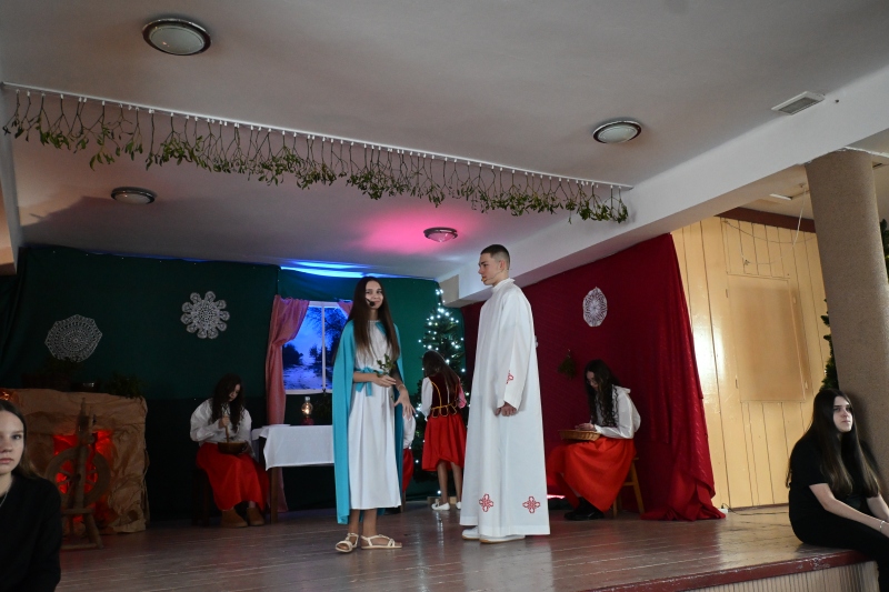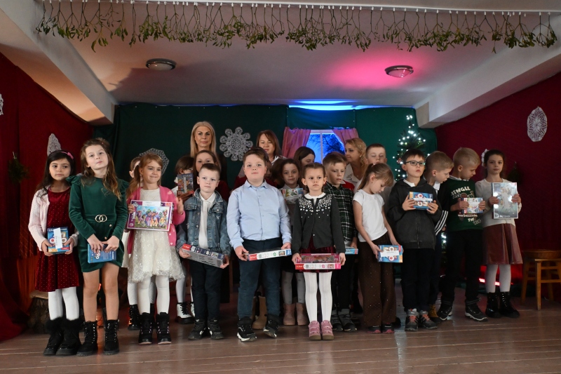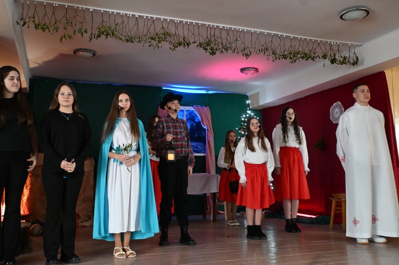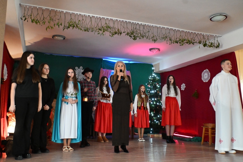 W dniu 19 grudnia 2025r. w Domu Kultury Filia Konieczno uczniowie naszej szkoły oraz grono pedagogiczne uczestniczyło w Misterium Bożonarodzeniowym w wykonaniu uczniów klas VI–VIII, opracowane przez ks. Tomasza Szotę. Młodzi aktorzy w niezwykle poruszający sposób przybliżyli widzom istotę świąt, tworząc wyjątkową, pełną refleksji atmosferę. Po części teatralnej zostały wręczone nagrody za udział w Konkursie na bożonarodzeniowy stroik. Na konkurs wpłynęlo 108 prac, a 53 z nich zostało nagrodzonych. Na zakończenie uroczystości pani Dyrektor Ewa Adrianowicz złożyła wszystkim zebranym świąteczne życzenia oraz podziękowała uczestnikom konkursu za tak liczny udział i wykonane stroiki, ozdoby świąteczne, szopki.