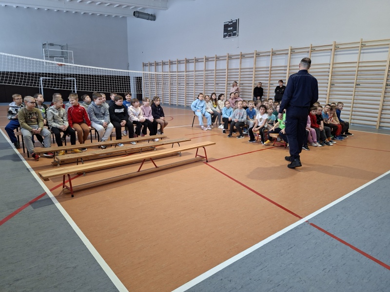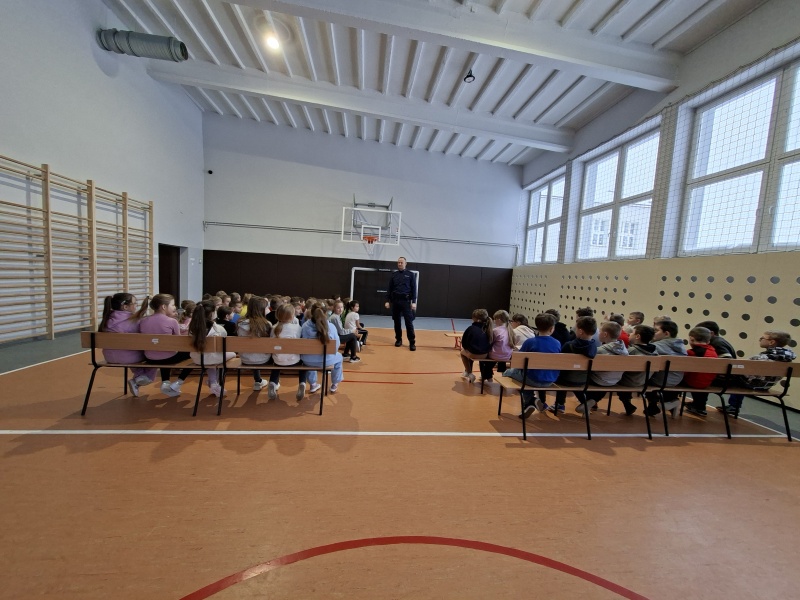 W dniu 13 stycznia 2026 roku w naszej szkole odbyło się spotkanie uczniów klas 1-3 z przedstawicielem policji. Spotkanie to dotyczyło zachowania bezpieczeństwa w czasie zbliżających się ferii zimowych. Policjant przypomniał zasady prawidłowego ubierania się w czasie zimy, zjazdów z ,,górki", jazdy na łyżwach, nartach, zasady organizowania kuligów, zabaw w tzw. rzucanie śnieżkami. Zwrócił uwagę, by nie wchodzić na zamarznięte rzeki. Prosił, by w razie wypadku czy niebezpieczeństwa dzwonić pod numery alarmowe: 999, 998, 997, 112. Pan Dzielnicowy życzył wszystkim uczniom oraz nauczycielom bezpiecznych ferii- bez żadnych kontuzji.