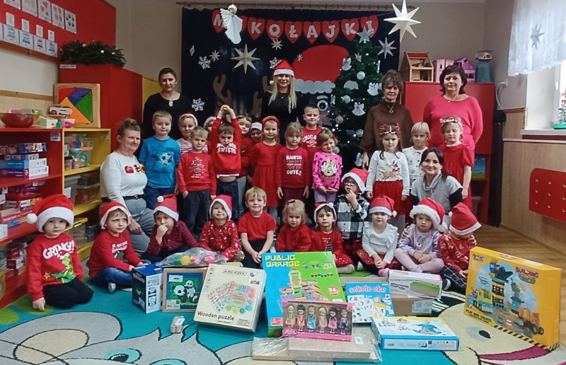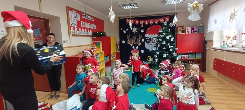 8 grudnia Pani dyrektor Ewa Adrianowicz spotkała Mikołaja, który podarował dla naszego przedszkola zabawki, gry i pomoce dydaktyczne. Pani dyrektor w imieniu Mikołaja wszystkie prezenty przekazała naszym przedszkolakom. Dzieci były zachwycone nowymi zabawkami, obiecały, że będą grzeczne cały rok. W podziękowaniu zaśpiewały i zatańczyły piosenkę ,,Mikołaju''.