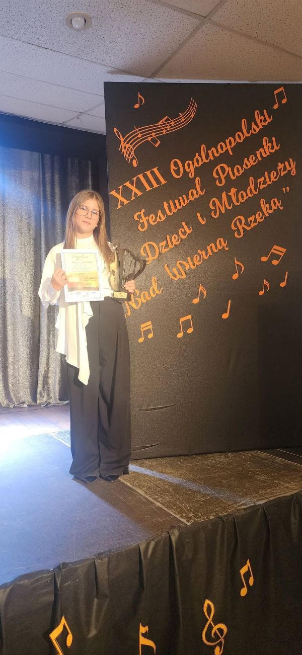 Uczennica klasy 6 naszej szkoły Alicja Jałocha, przy akompaniamencie Krzysztofa Jończyka, stworzyła wyjątkowy, poruszający klimat, który zachwycił jury i publiczność. Jej dojrzała interpretacja i muzykalność zostały nagrodzone I miejscem w XXIII Ogólnopolskim Festiwalu dla Dzieci i Młodzieży ,,Nad Wierną Rzeką" w Małogoszczy.