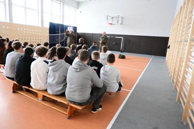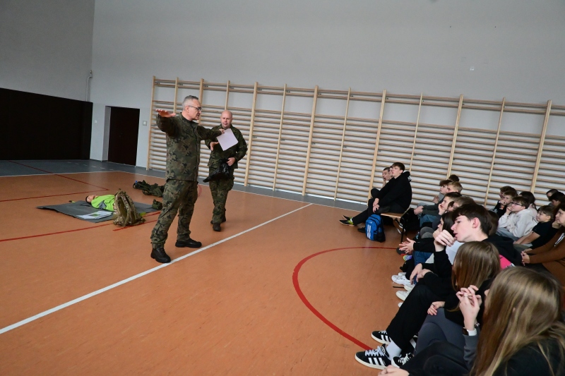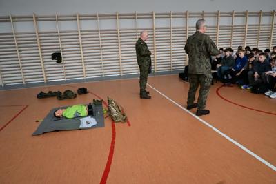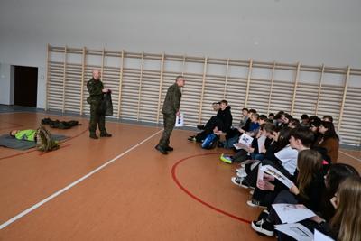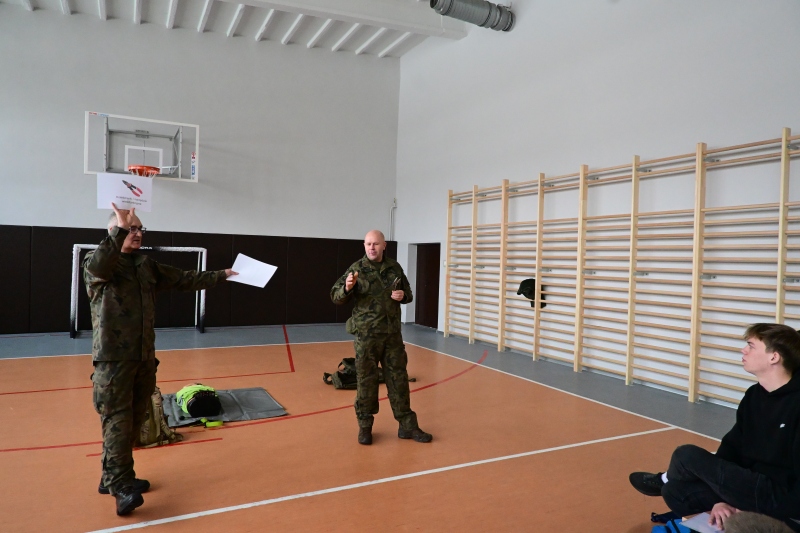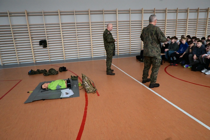 Program ten jest wspólną inicjatywą Ministerstwa Edukacji Narodowej oraz Ministerstwa Obrony Narodowej i polega na prowadzeniu w szkołach specjalnie opracowanych zajęć przez żołnierzy Wojska Polskiego. Zajęcia dla naszych uczniów przeprowadzili żołnierze z Jednostki Wojskowej Bukówka w Kielcach. W trakcie spotkania uczniowie zdobyli cenną wiedzę w zakresie bezpieczeństwa i obronności. Mieli również okazję uczestniczyć w praktycznych ćwiczeniach kształtujących podstawowe nawyki oraz umiejętności związane z reagowaniem w sytuacjach kryzysowych. Ważnym elementem warsztatów była także nauka pierwszej pomocy przedmedycznej, podczas której uczniowie mogli zdobyć wiedzę i umiejętności przydatne w nagłych sytuacjach zagrożenia życia lub zdrowia. Zajęcia spotkały się z dużym zainteresowaniem młodzieży i były dla uczniów cenną lekcją odpowiedzialności, współpracy oraz dbałości o bezpieczeństwo swoje i innych.